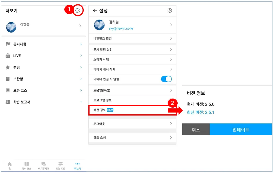 최신 버전이 아니라면, [업데이트]를 눌러 App 업데이트를 진행해주세요.