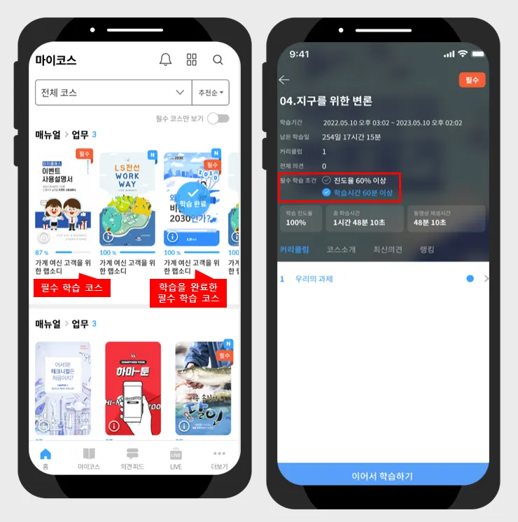 ”필수”가 표기된 코스를 선택하면 “필수 학습 조건”을 확인하고 학습을 시작할 수 있습니다