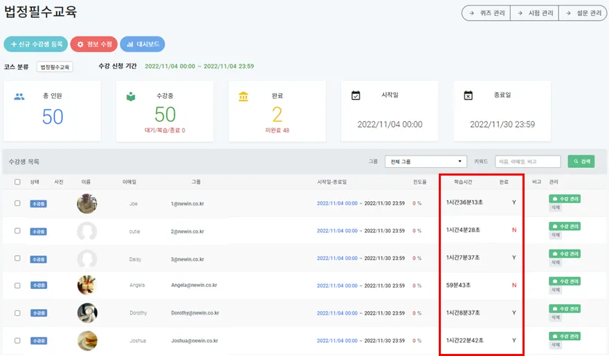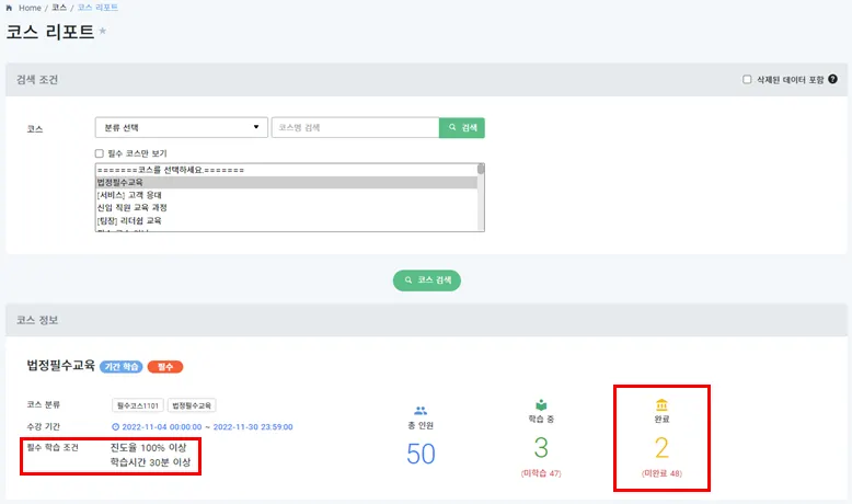 학습을 완료한 학습자와 완료하지 못한 학습자를 확인하고 관리할 수 있습니다.