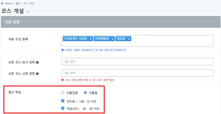 진도율, 학습시간으로 필수 학습 조건을 설정하여 코스를 개설할 수 있어요!