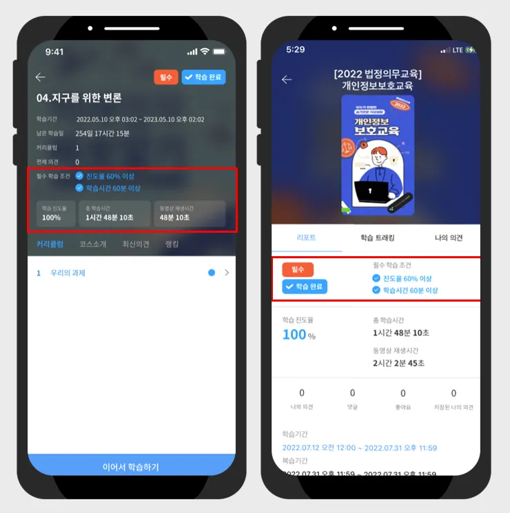 총 학습시간, 동영상 재생시간, 필수 학습 완료를 확인할 수 있어요!