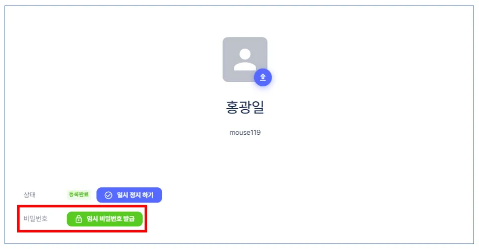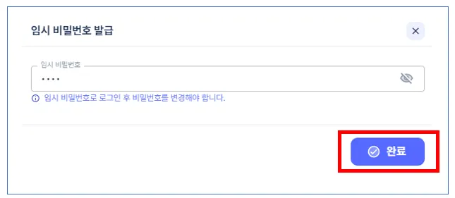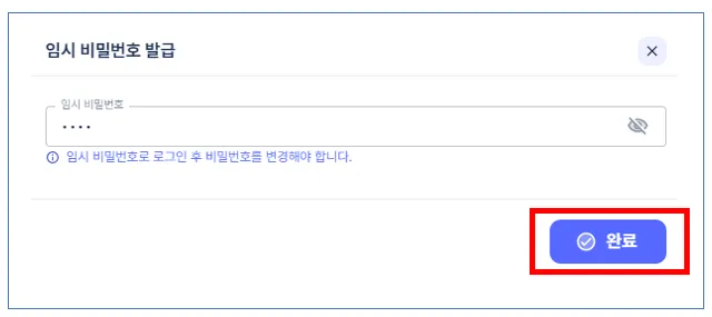 [임시 비밀번호 발급]을 선택하고 입력 후 [확인]을 클릭하면, [처리완료]가 됩니다.