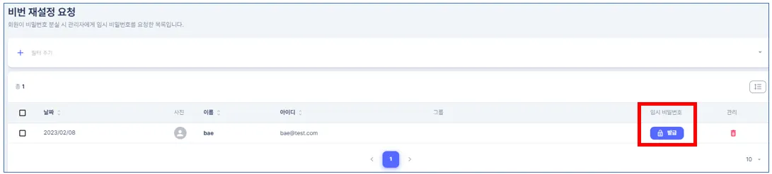 비밀번호 재설정을 요청한 회원을 일괄 선택하여 임시 비밀번호를 발급할 수 있습니다.