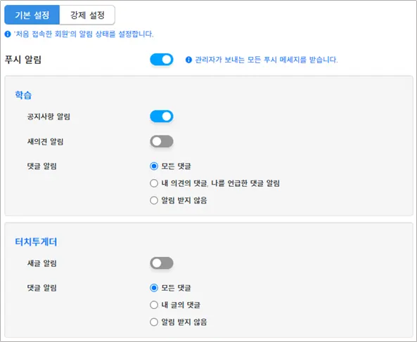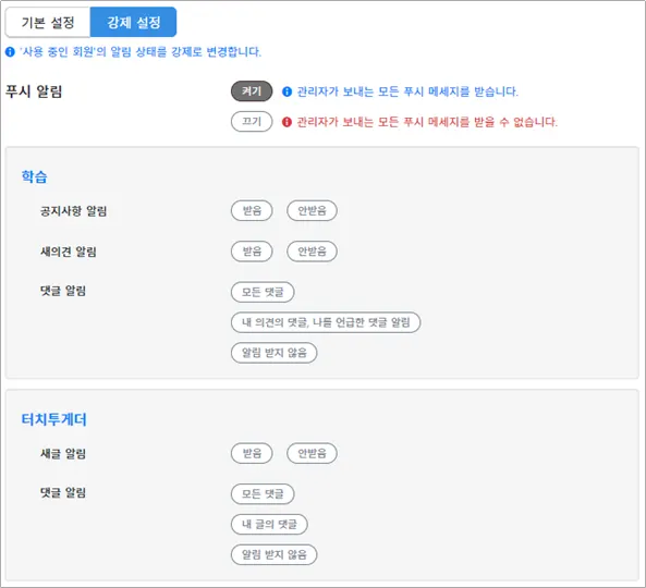 푸시 알림 설정이 기본 설정과 강제 설정으로 세분화되었습니다.