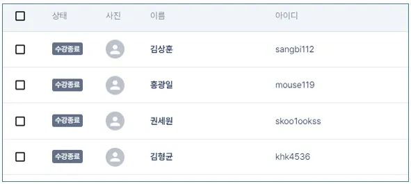 수강 관리→수강생 목록→전체 수강생의 '수강 종료'상태가 확인됩니다.