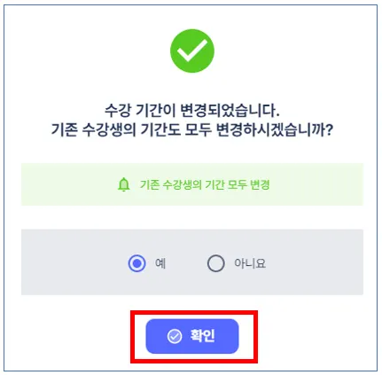 - 수강 등록 되어있는 전체 수강생의 수강 기간이 변경됩니다.
