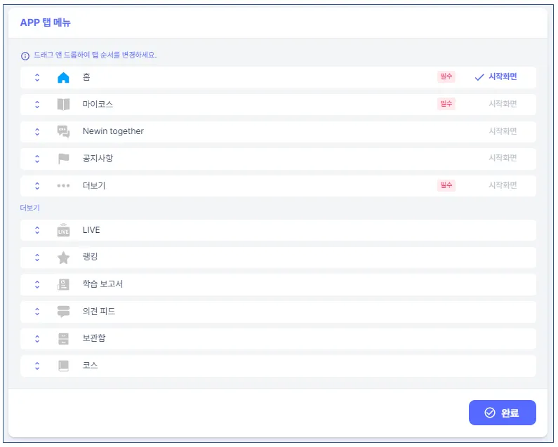 ④ 각 탭 메뉴의 순서를 변경하고, App 접속시 첫 화면 메뉴를 설정합니다.
