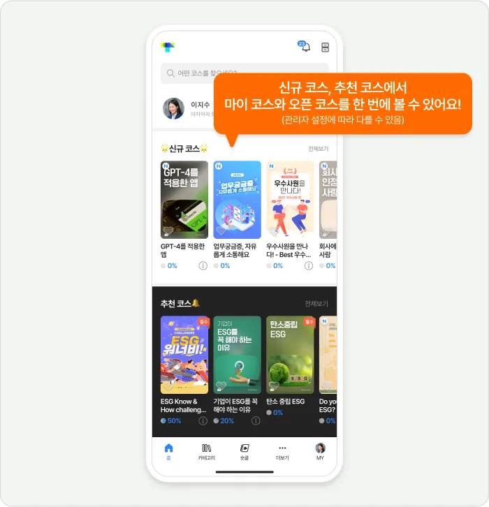 관리자 설정에 따라 신규 코스, 추천 코스를 확인하고 학습을 시작할 수 있어요.