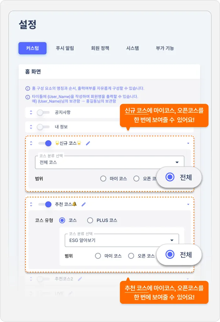 마이 코스, 오픈 코스를 모두 운영하는 경우 신규 코스와 추천 코스에 마이 코스, 오픈 코스를 한 번에 보여줄 수 있습니다. 코스 운영 방식에 따라 더 효과적으로 운영해보세요.