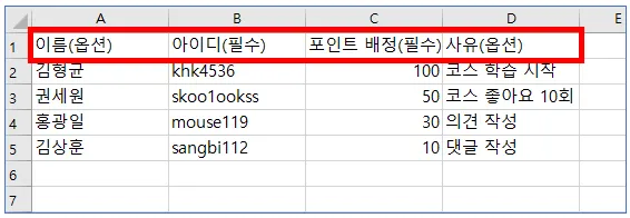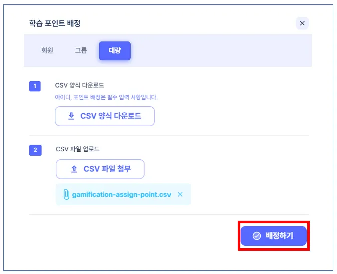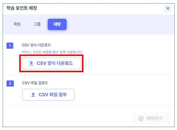 • 대량(엑셀 업로드) : 양식 파일에 이메일(아이디), 배정할 포인트, 사유를 입력한 후 업로드