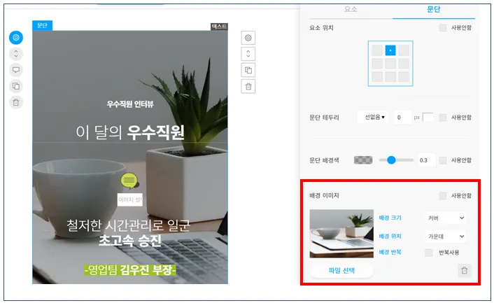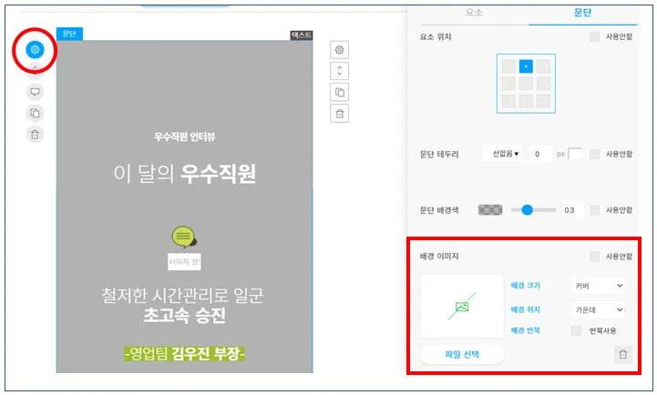 콘텐츠 에디터 → 배경 이미지를 삽입할 문단을 선택합니다.