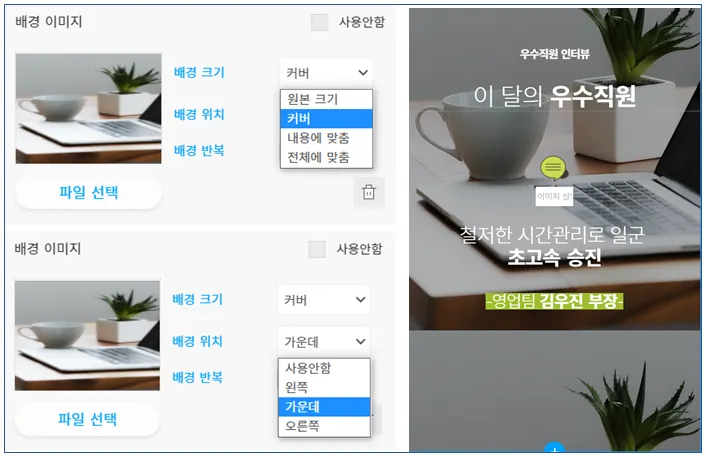 배경 이미지가 삽입된 문단을 확인하고, 배경 크기 및 위치, 반복 여부를 설정합니다.