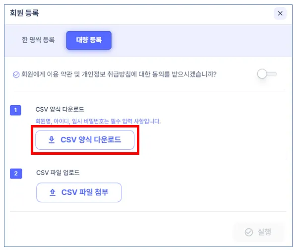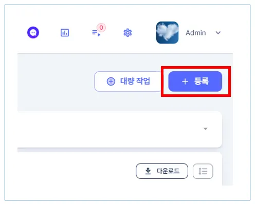[등록]→[대량 등록]을 선택하고 CSV양식을 다운로드 받습니다.