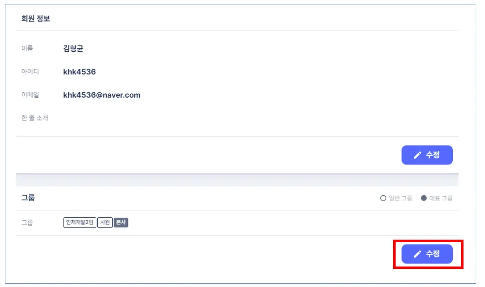3. 회원 정보 수정 메뉴에서도 그룹을 변경하고 대표그룹을 설정할 수 있습니다.