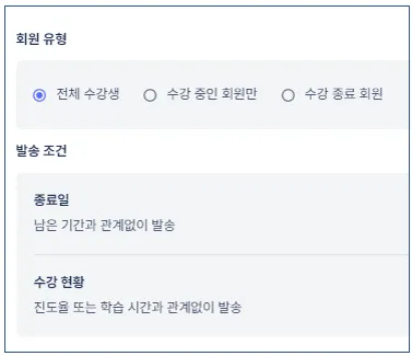 회원 유형 : 전체 수강생 선택시, 수강 등록되어 있는 모든 회원에게 푸시 메시지가 발송됩니다.