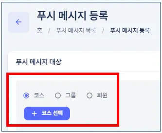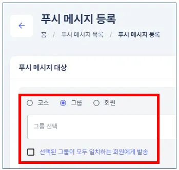 발송 대상에 따라 회원/그룹/코스별 푸시 메시지를 발송할 수 있습니다.