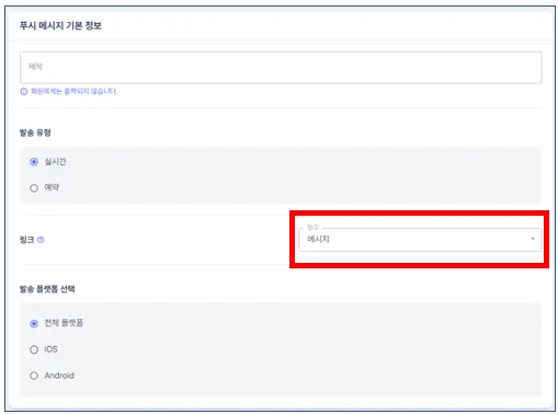 ② 제목, 발송 유형(실시간/예약), 링크, 발송 플랫폼(IOS/Android), 푸시 메시지를 발송할 그룹을 선택합니다.