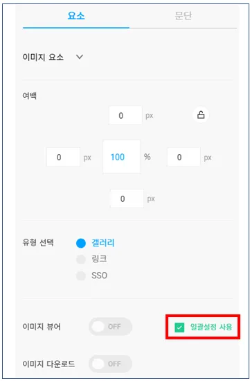 콘텐츠에 있는 각 이미지 요소 설정 → 이미지 뷰어 및 다운로드 [일괄설정 사용] 체크되어 있어야 합니다.