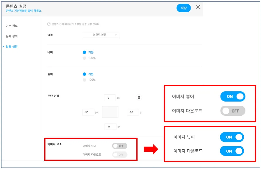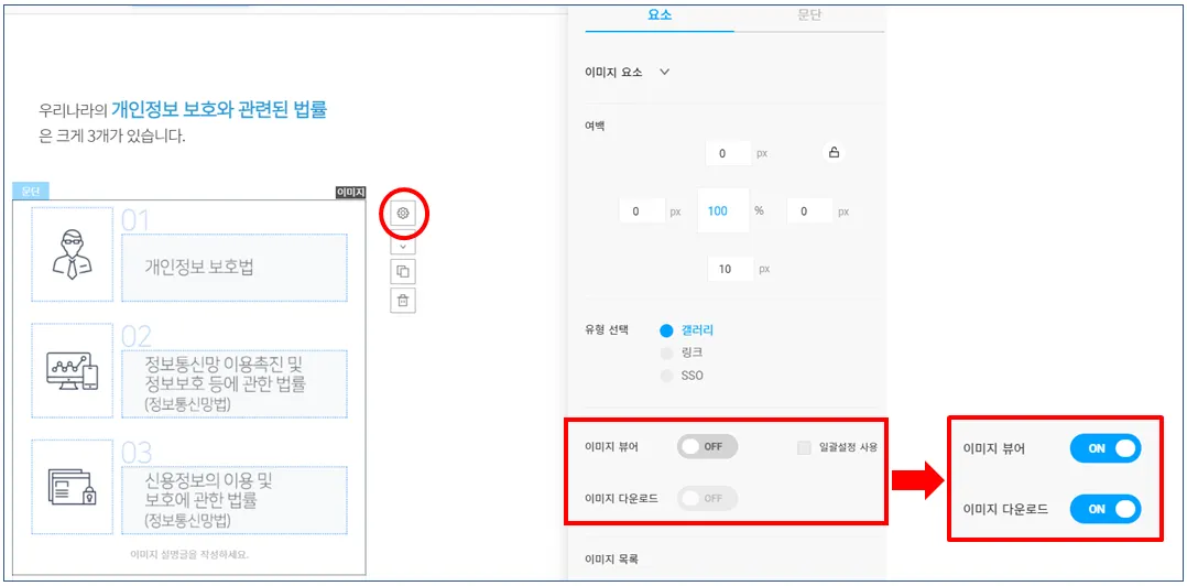 콘텐츠 에디터에서 [이미지 뷰어, 다운로드 ON/OFF]를 설정할 수 있습니다.